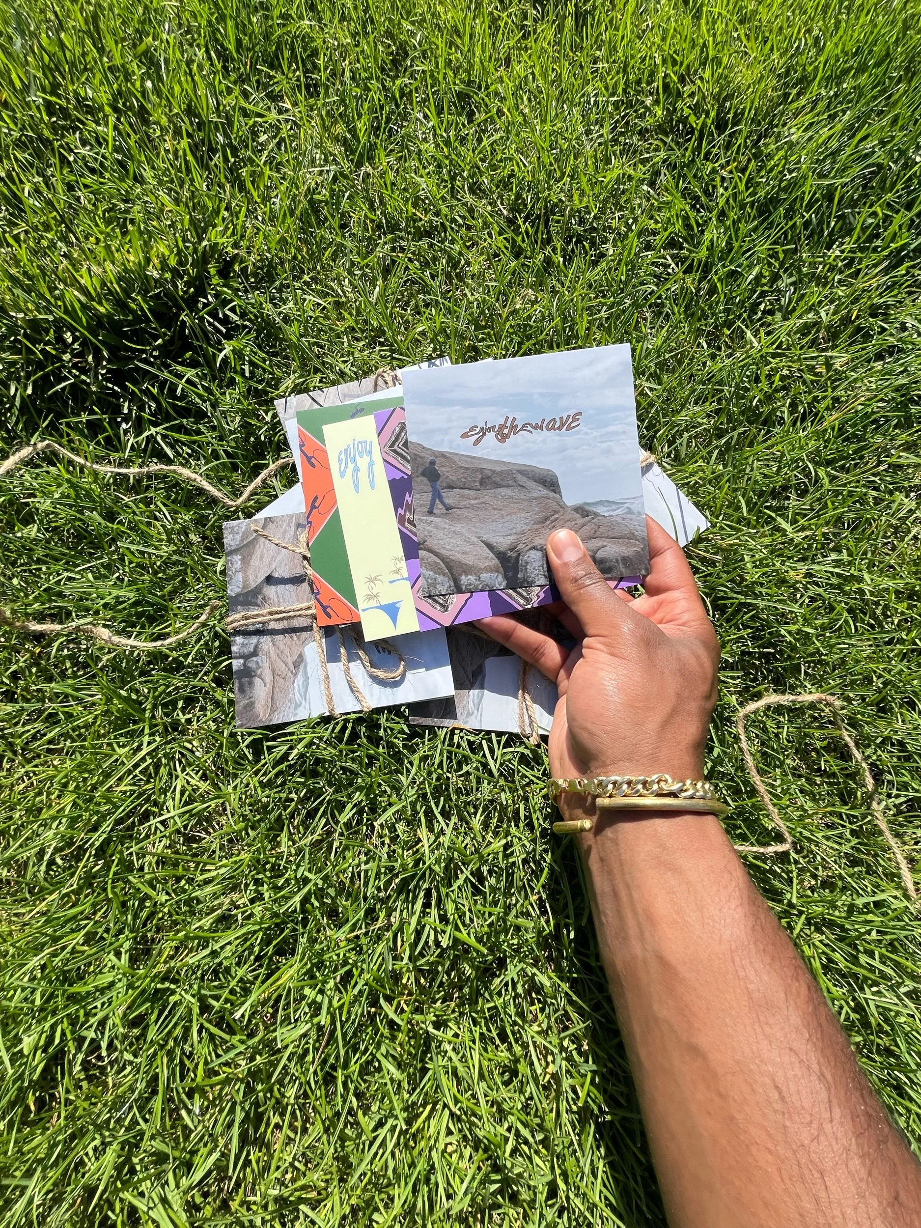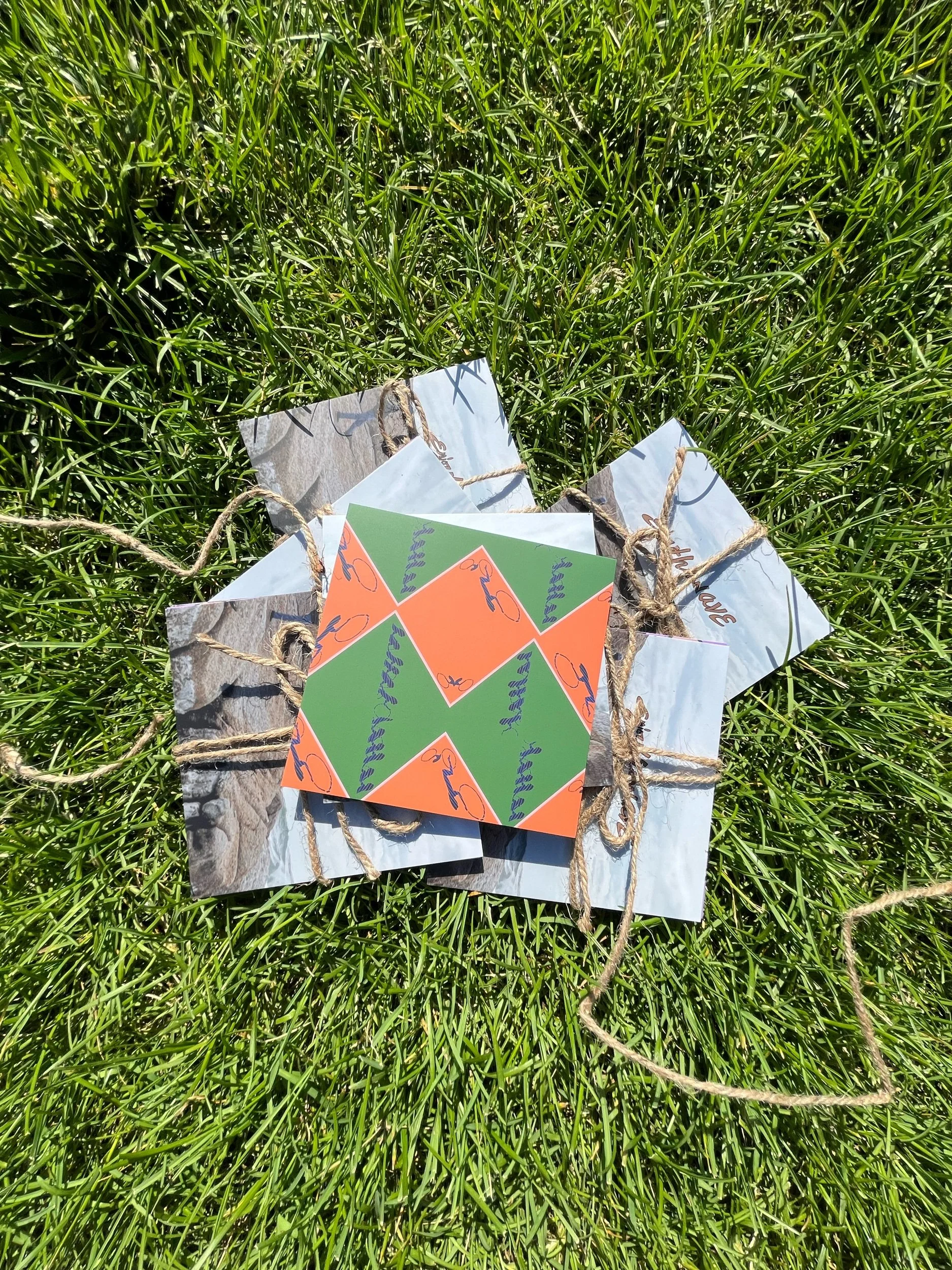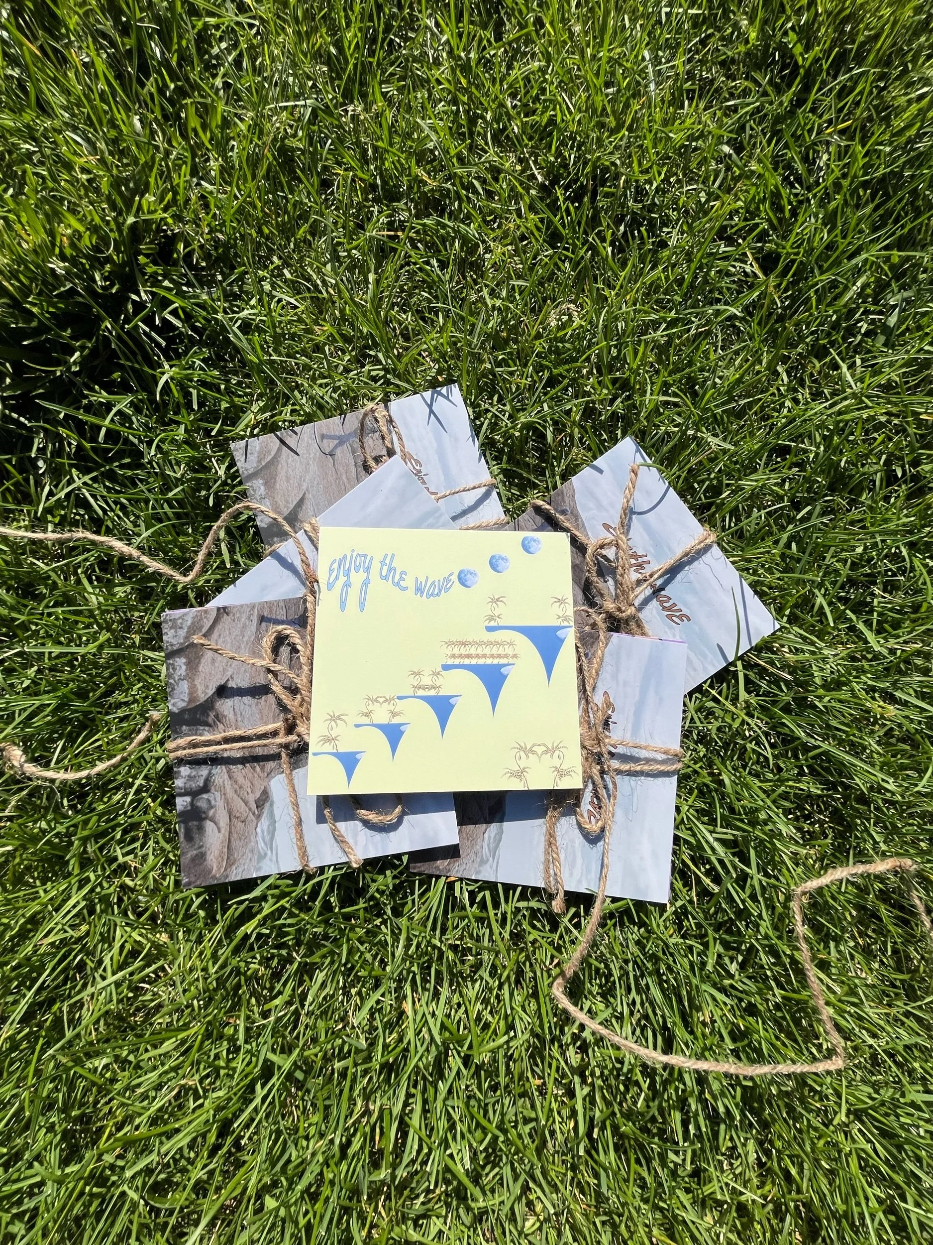 Each bundle includes four distinct images, with the iconic Saunders Beach shot duplicated for a total of five cards. These images evoke a mix of dynamic, colorful designs and photographs, hinting at the connection between effort and flow. From a bold interplay of orange and green to calming ocean-inspired lines, each card reflects the spirit of “Enjoy the Wave”: embrace challenge, find your flow, and share the ride.